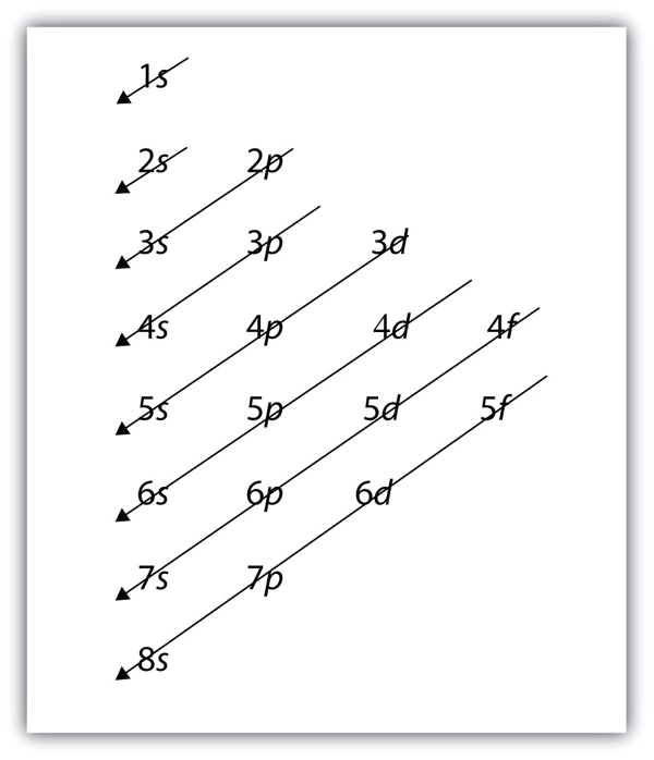 For larger and larger atoms, the order of filling the shells and subshells seems to become even more complicated. There are some useful ways to remember the order, like that shown in Figure 8.08 “Electron Shell Filling Order.” If you follow the arrows in order, they pass through the subshells in the order that they are filled with electrons in larger atoms. Initially, the order is the same as the expected shell–subshell order, but for larger atoms, there is some shifting around of the principal quantum numbers. However, Figure 8.08 gives a valid ordering of filling subshells with electrons for most atoms.