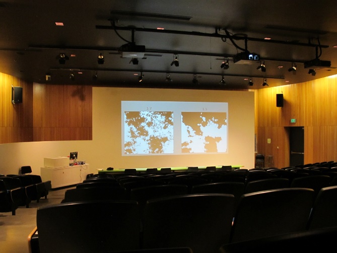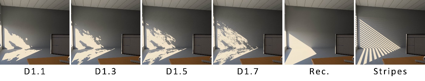 The experiment was conducted in a windowless lecture hall in the afternoon during the Spring term. An overhead projector was used to project the renderings on a white wall located in front of participants. Projection area of each light pattern was 7 x 7 feet. Participants were seated in front of the projection wall such that each participant has a clear unobstructed view. Electric lighting in the room was set to allow for a clear contrast between light pattern projections and room surfaces. The luminance values of white and black areas of the patterns were 45 cd/m2 and 9 cd/m2, respectively. Lighting levels remained constant for the entire duration of the experiment (Fig.2).
