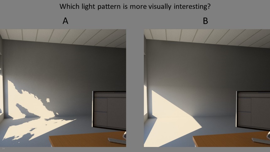 In interior environments, the shape of sunlight patterns in space is often influenced by exterior and/or interior obstructions such as trees. The resulting dappled shadows and sunlight patterns might have positive psychophysiological effects. However, because participants in most previous studies viewed the fractal patterns on a computer screen (Taylor et al. 2005; Hagerhall et al. 2015; Spehar et al. 2003), it is unclear whether the same positive reported response can be elicited in interior environments using fractal light patterns. When a fractal pattern is viewed on room surfaces, as opposed to on a computer screen, new variables such as projection surfaces, viewing angle, size of the pattern, space geometry, the use of light projection, light reflectance values of surfaces, and luminance variability can influence the visual preference or interest of these patterns. As a first step to bridging this gap, this study aims to examine the visual interest of fractal and non-fractal patterns in renderings of an interior space and to compare results to visual preference from previous studies.