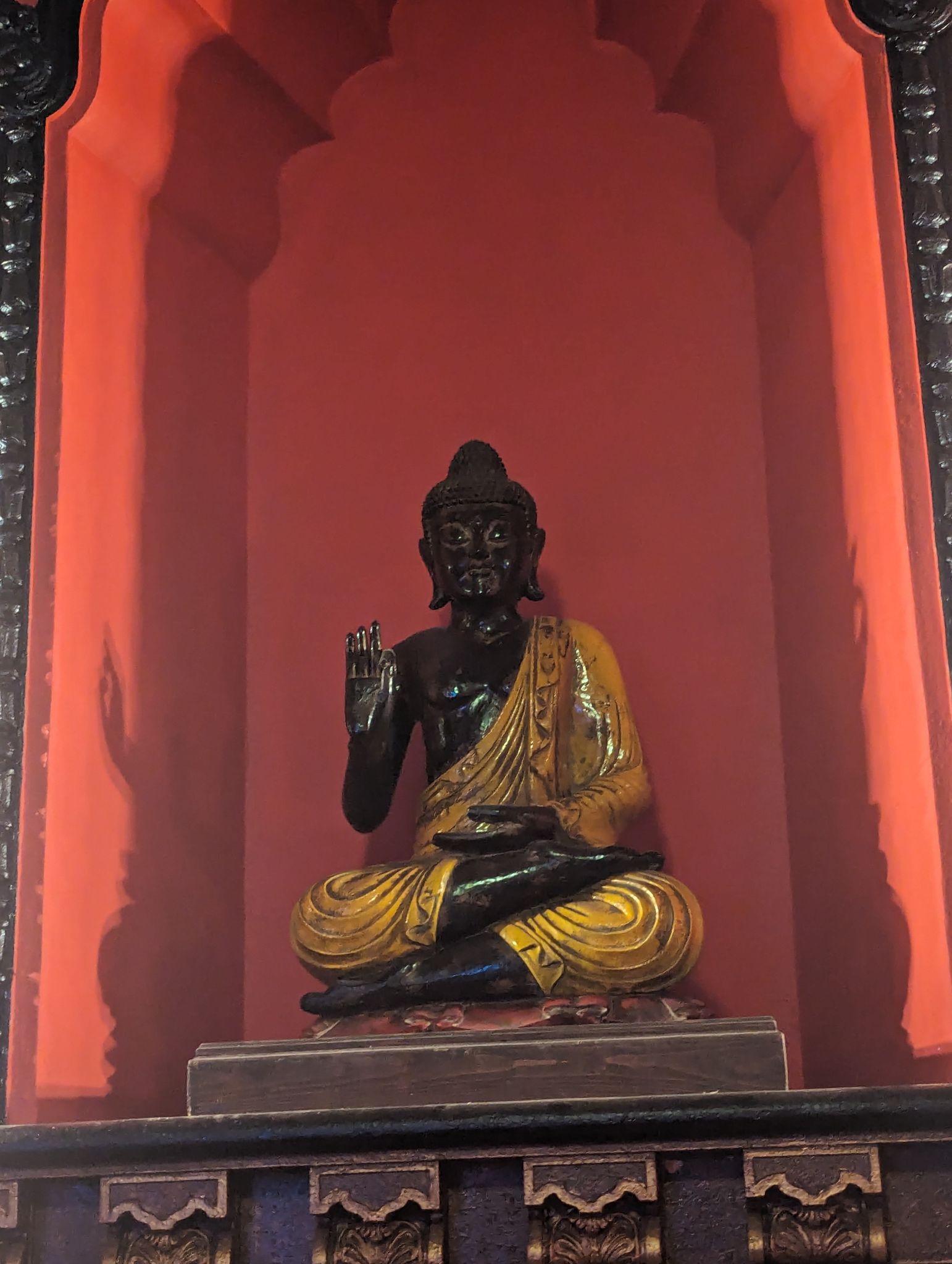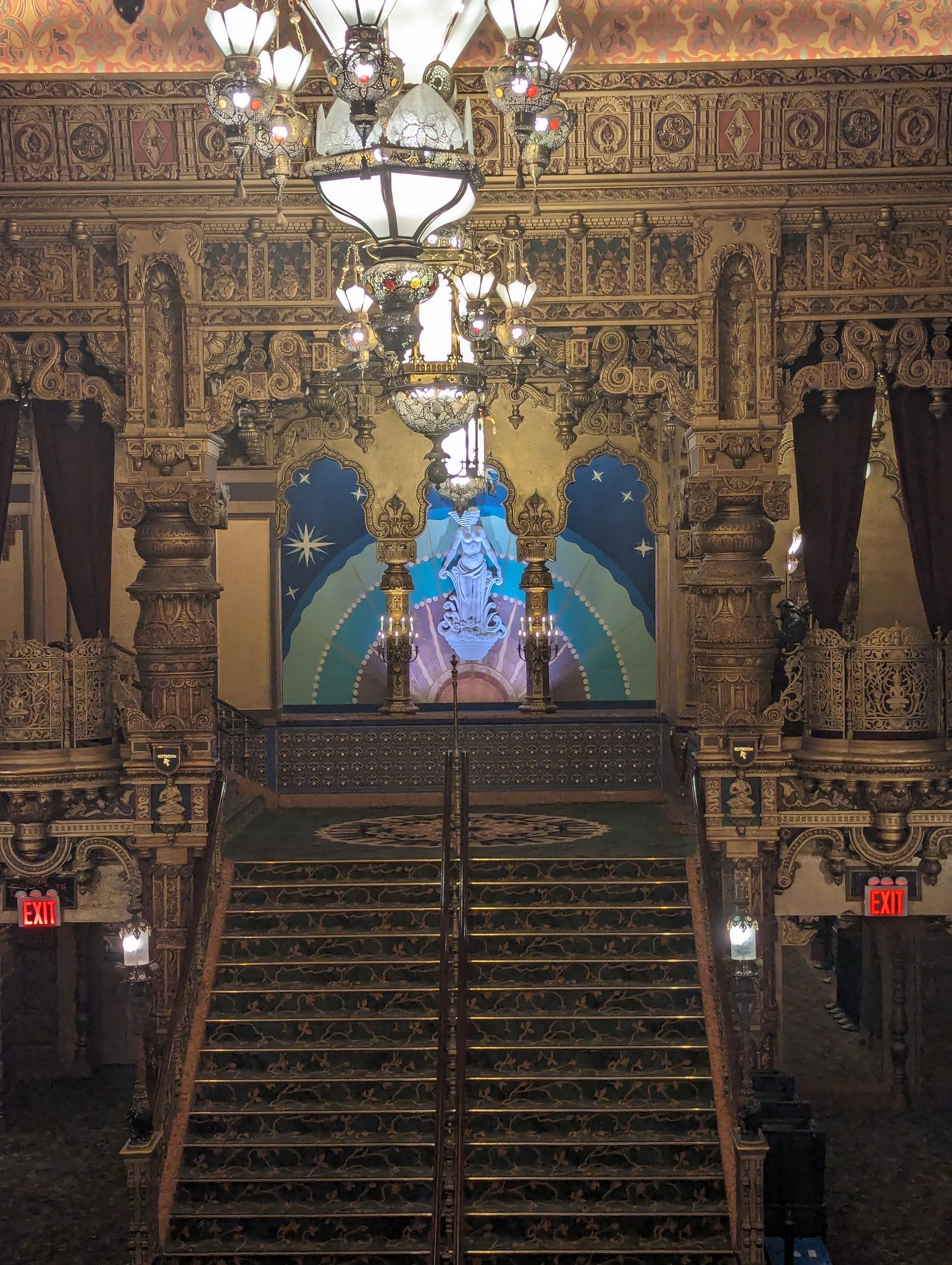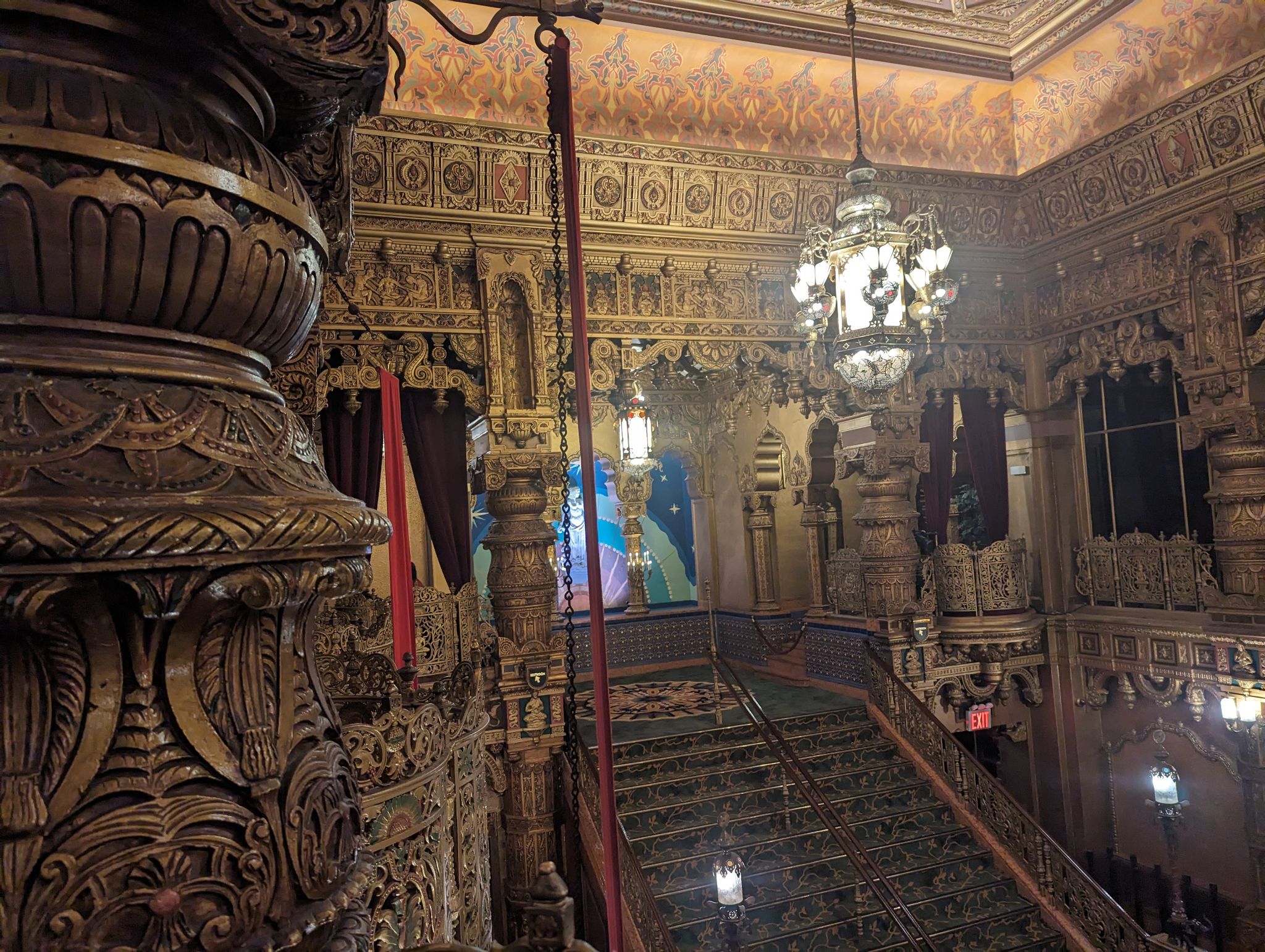 The United Palace started as a premier vaudeville and movie house built in the 1930s, with its interior and exterior being seemingly inspired by Hindu Temples as the walls have statues of a Hindu goddess, either Saraswati or Lakshmi, and the heavy use of gold motif. Gold is heavily tied to the Hindu Mythos, connecting Brahma and other Hindu Gods who are depicted wearing Gold jewelry and ropes lined with the material. Gold is a metal that will never rust, it has been used for centuries as jewelry, statues, currency, and on the walls of Hindu temples. Lakshmi is the goddess of prosperity and immortality whom people worship to bring material and spiritual wealth into their homes and temples. Of course, gold is also a symbol of wealth or power in most societies and cultures as well. for example, the Tabernacle in Christianity is usually made of a gold-like metal. Also, gold is a symbol of incorruptible purity and has a high value to God. It’s a bit fitting that a place covered in gold would be in the same place where Rev. Ike would preach about lifting yourself from poverty and becoming wealthy to appease God with tributes or donations to his congregation.