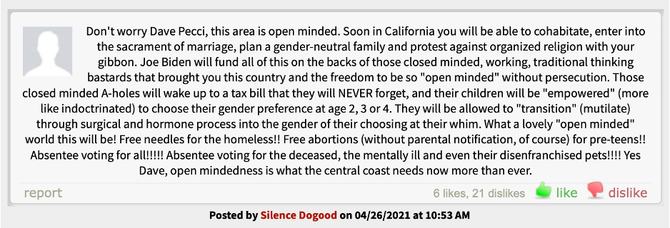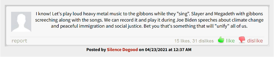 And although the original conflation of gibbon song, noise pollution, and heavy metal appears to be wholly facetious, this latter poster embraces the acoustic’s capacity to drown out competition. Positioning gibbon conservation’s ecological conservatism in conflict with a distinctly social form of conservativism, they suggest that “We can record it and play it during Joe Biden speeches about climate change and peaceful immigration and social justice”. Note that the poster has adopted the username Silence Dogood—a pseudonym famously employed by a young Benjamin Franklin in 1722 to express his opinions anonymously in a local news outlet. At once advocating for the attenuation of gibbon vocalizations and grounding the author’s reactionary political position in hagiographic reference to a triumphalist reading of American history, this choice of username is a particularly apt way to situate their claims within a long history of American moral panics over invasion (whether human or other). And indeed, in Silence Dogood’s subsequent post, the question of gibbon survival on California land becomes entangled in a hyperbolic litany of right-wing tropes laden with heteropatriarchal entitlement and transphobia (Figure 5; CW: hate speech). As it begins, “Soon in California you will be able to cohabitate, enter into the sacrament of marriage, plan a gender-neutral family and protest against organized religion with your gibbon.” And although this statement, which quickly devolves into hate speech, was rebutted by other posters and eventually received a high ratio of dislikes to likes (6 likes and 21 dislikes), these claims apparently did not trigger the New Times’ comment policy, specifically that “comments that are irrelevant or incendiary will be deleted”[30]—the post remains publicly available online.