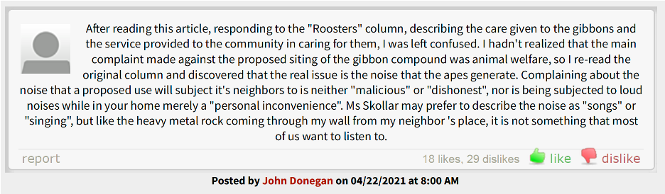 The backlash to the perceived nuisance of gibbon vocalizations that culminated in the April 2021 protest played out predominantly online. Soon after the Center’s relocation plans were announced, one resident voiced her opposition in an opinion piece published on the website of the New Times San Luis Obispo, the region’s local newspaper: