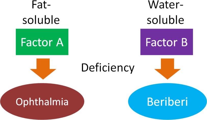 Unlike minerals, vitamins are all organic compounds. The thirteen vitamins are categorized as either water-soluble or fat-soluble. The water-soluble vitamins are vitamin C and all the B vitamins. The fat-soluble vitamins are A, D, E, and K. Vitamins are required to perform many functions in the body such as making red blood cells, synthesizing bone tissue, and playing a role in normal vision, nervous system function, and immune system function. Vitamin deficiencies can cause severe health problems. For example, a deficiency in niacin causes pellagra. Until scientists found out that better diets relieved the signs and symptoms of pellagra, many people with the disease ended up in insane asylums awaiting death (Watch Video 1.2). Other vitamins were also found to prevent certain disorders and diseases such as scurvy (vitamin C), night blindness (vitamin A), and rickets (vitamin D).