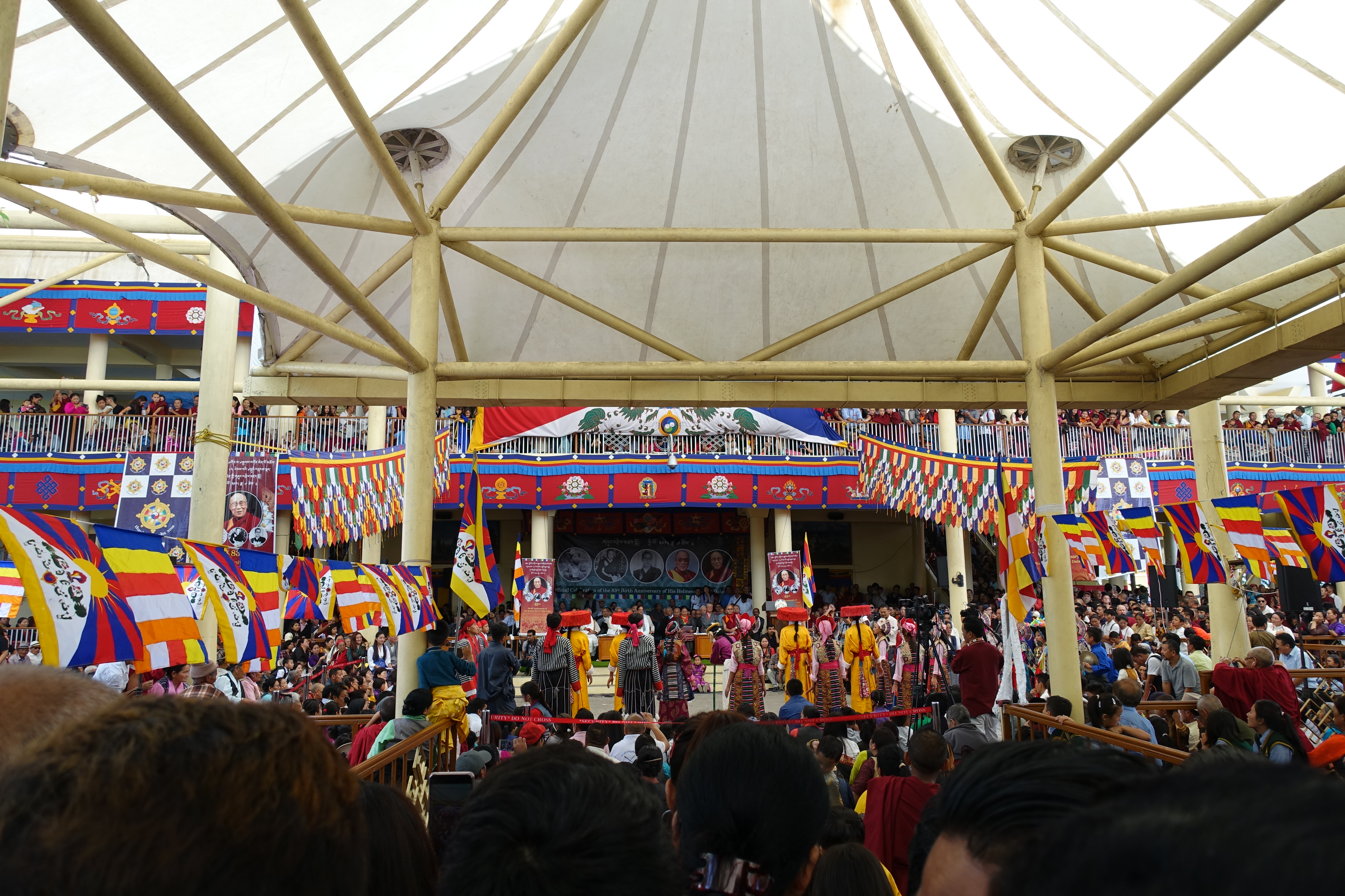 The official ceremony in Dharamsala emphasizes the holiday’s nationalist sentiment. The courtyard in which the annual ceremony takes place is decorated with large and small Tibetan national flags, and hundreds of streamers in the flag’s colors (see above). While performers, speakers, and audience members filter in for hours starting in the early morning, the ceremony does not officially begin until the Sikyong, the President of the Tibetan government-in-exile, marches through the center of the courtyard to his seat onstage, accompanied by a drum-and-flute ensemble, and ceremonially raises the national flag while everyone present stands and sings the Tibetan national anthem. In other words, the ceremony features all of the pageantry of a Tibetan national event. In this setting, Cholsum Droshey’s nationalist message rings loud and clear. No one was surprised when the anonymous deejay chose to play this song on this nationally significant holiday. Here, dancers and onlookers celebrate the song’s message, and perform the tri-regional national unity described in the chö kha sum narrative.