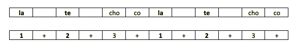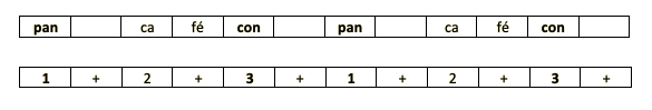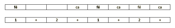 Finally, for sones de pareja in 2/4, the mnemonic device is a triple repetition of the word café over a two-measure cycle. Each syllable represents one eighth-note. The end of the repetition on the accented syllable fé coincides with the downbeat at the end of each cycle: