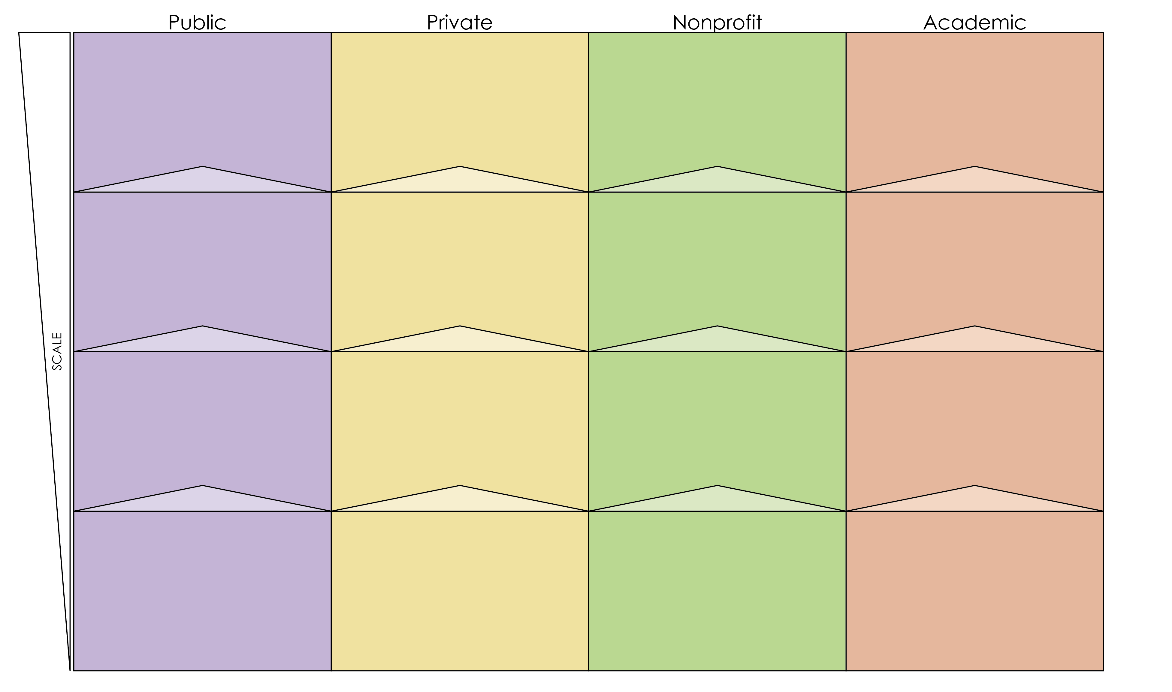 Inspired by existing work around social resilience and bonding, bridging, and linking capital, in 2016 the CAD research team developed an adaptive approach to identifying and reaching out to community participants within the CAD process. To better understand the nature of existing networks and social resources on which CAD engagement relied, the research team began to parse community roles of participating actors and stakeholders by scale of influence (local grassroots to state-level roles) on a vertical axis and, as a surrogate for interest, sector of activity, as public, private, nonprofit, and academic, on a horizontal axis (Figure 4), roughly corresponding with the vertical and horizontal dimensions of social capital suggested by Woolcock (2001). The potential for introduction or enhancement of linking capital can be indicated by connections and relationships between stakeholders at different points on the vertical axis of scale, the same for bridging capital along the horizontal axis of sector, and within individual boxes, bonding capital.