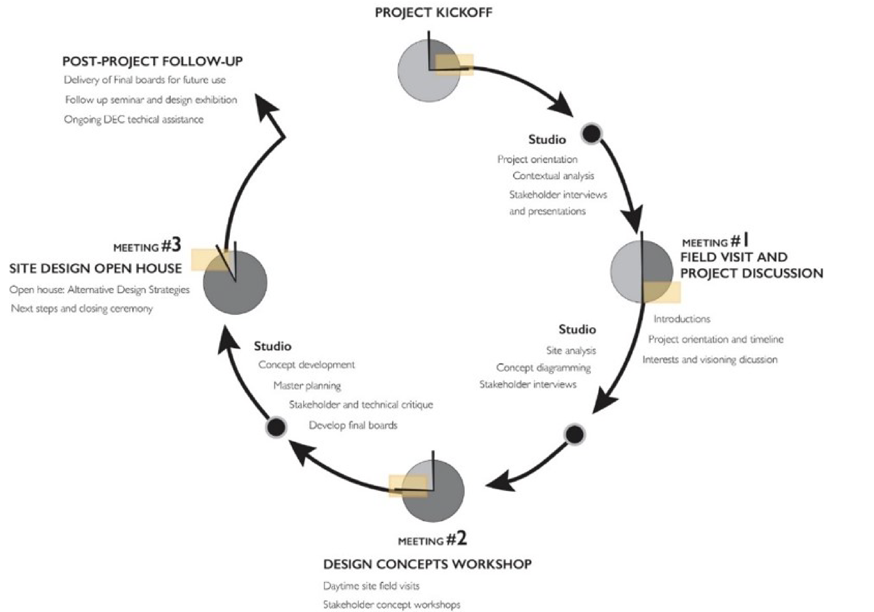 In 2014, we began an engaged studio process that pursued opportunities for enhancing the climate-adaptive performance of urban waterfronts by working with stakeholders on place-based questions of resilience in their municipality. This work builds on a long history of service learning in landscape architecture investigating pedagogies for studio-based community engagement described by Forsyth, Lu and McGirr (1999), Lawson (2005), and many others. The Cornell Climate-adaptive Design (CAD) studio emerged from studio curricula piloted in 2013 exploring the integration of comprehensive, physical climate-adaptation strategies in urban design studio coursework (Cerra, 2016). The initial approach was primarily informed by existing strategies for resilience of place, contextualized by current climate change projections. Students were immersed in studying the risks and threats of climate change as well as adaptation strategies such as green infrastructure, resilient planting design, and floodplain storage. Early curriculum development focused heavily on ecosystems, hydrologic systems and built-environment support, with an emphasis on site-level metrics to target and evaluate design effectiveness, to build a comprehensive framework centered primarily on physical and ecological aspects of climate-adaptive design (Cerra, 2016).