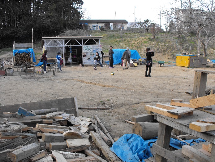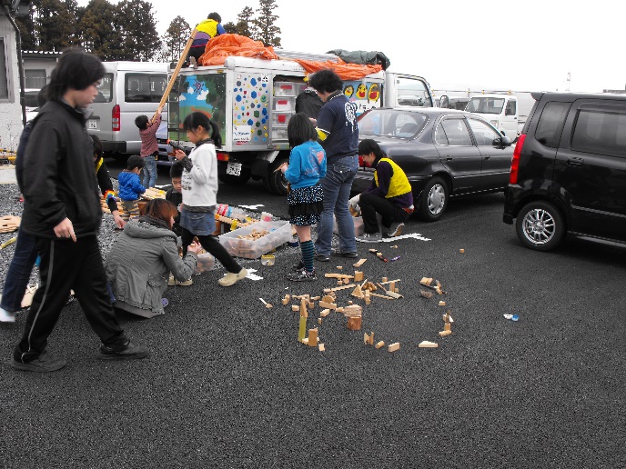 This is particularly concerning because of the children’s right to play, enshrined in the UN Convention of the Rights of the Child – I am not aware of any similar international right of adults to park cars. The more frequently observed temporality was in time, rather than space, when play workers, with a truck or car, would take loose parts to temporary housing on a pre-advertised schedule. Found spaces for play were where children just did what they do and played. Driving through one devastated area during a storm we observed a group of boys in the distance kicking a football around while in one of the temporary housing areas children were playing in the metre gap between the temporary housing units.