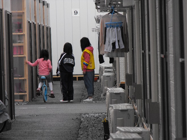 Lost spaces included those which had been associated with a kindergarten, school, park and even a specific space of an elevated adventure playground on the Sendai coastal plain. Spaces might be temporary in both space or time and were usually associated with temporary housing. However the provision of designated spaces for children to play in safely in temporary housing was very, very limited, indeed often absent. In these locations there was a dominance of tarmac for designated car parking spaces and it is not clear why protected spaces for children’ splay had not been provided.