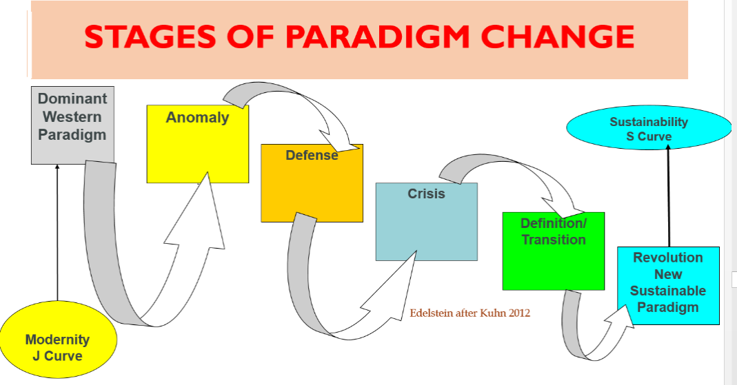 I describe this process of change by building on Kuhn’s implicit model derived from his work on scientific transformation (1962). As shown in Figure 7, our societal lifescape, the Dominant Social Paradigm of Western Society (Dunlap and Van Liere, 1984; Milbrath, 1984) guidesus to make such assumptions as human’s rightful ascendency over nature and ability to use it freely for their own ends and that man can solve all problems with technology. This dominant paradigm is challenged by anomalies, events that are disconfirming. For a time, these anomalies can be discredited, rationalized and denied, but when they evidence serious challenge beyond defense, a paradigmatic crisis results until a new direction is found that addresses the anomalies. Once this new pathway is sufficiently mapped out, a “paradigmatic revolution” can follow, in this case, leading to a new Sustainable Paradigm. We can view Environmental Turbulence as anomalous events, much of our recent time as taken up with defenses of the old paradigm and the current period of confusion as a time of paradigmatic crisis. The task now is to become paradigm writers, articulating the new sustainable paradigm. Many are engaged in this task. The endpoint is overcoming the disabling nature of modernity and enabling a transformation to a sustainable successor paradigm.