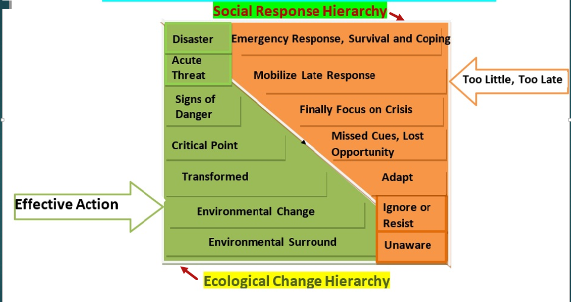 Using the model of Social Process in Eco-historical Context, we realize that different dynamics occur at different levels of social process. Accordingly, while the documentation of Psycho-Social Impact may serve the important function at the individual, family and community level of social process of validating how people are affected by Environmental Turbulence and assisting claims for assistance, at an institutional and societal level, the dynamics may be very different.