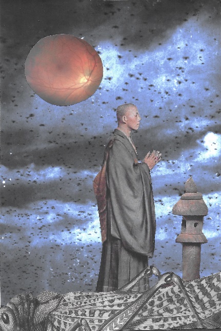 The sun/moon—it could be either—is a photograph of my eye. The significance of the eye is that when he became an arahat, Cakkhupala became blind. This was the result of kamma. In a previous life, Cakkhupala was a doctor. One of his patients said she and her children would become his servant if he cured her. When she was almost cured, Cakkhupala discovered that the woman was not intending to fulfill her agreement. He then gave one last treatment which he knew would blind her.