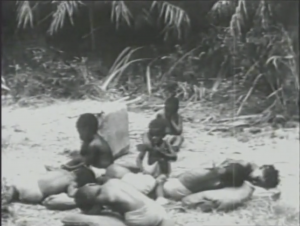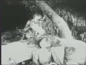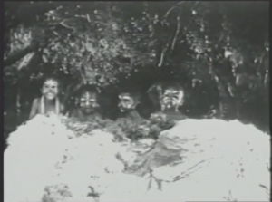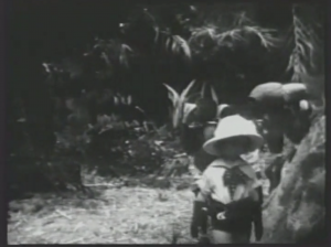 The “cannibals” emerge out of the jungle with their teeth bared and their bodies covered in mock tribal markings. They are pictured here peeking over the bushes at Shirley Temple and the porters.