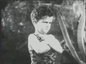 Then enters the young White boy mimicking Tarzan. He beckons an elephant and rides into the scene to save Shirley Temple. Upon seeing him standing there with his arms crossed, all the”cannibals” flee the scene screaming.