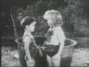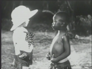 Kid ‘In” Africa starring Shirley Temple as Madame Cradlebait is a short American comedy film produced in 1933.The film shows colonized Black children as porters, a group of Black children depicted as “cannibals,” a White girl who leads an expedition, and a White boy, Tarzan.