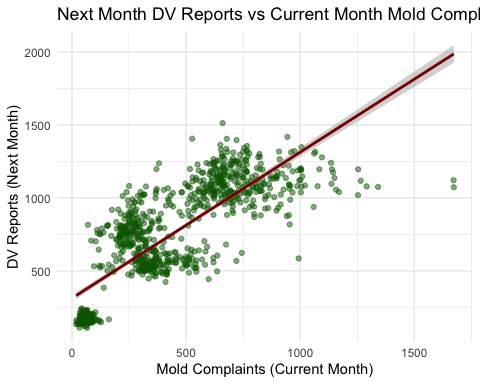 #> 0.8102952I conducted a Pearson’s correlation test to examine the relationship between mold complaints in one month and DV reports the following month.