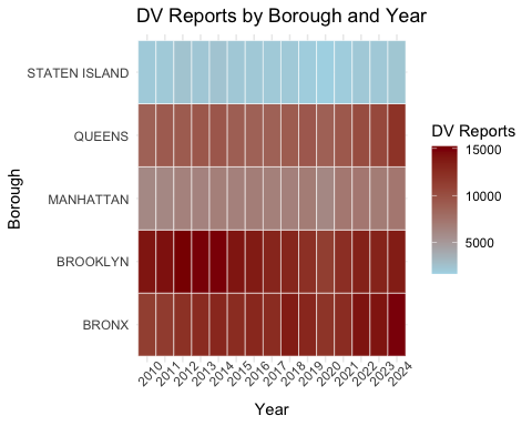 In summary, the analysis suggests a consistent positive relationship between residential mold complaints and domestic violence reports, but borough-level differences and other contextual factors appear to drive much of the variation, highlighting the complexity of environmental and social influences on public health outcomes. In the future, I would like to look at neighborhood-specific trends, or DV/mold rates instead of counts as populations vary across boroughs.