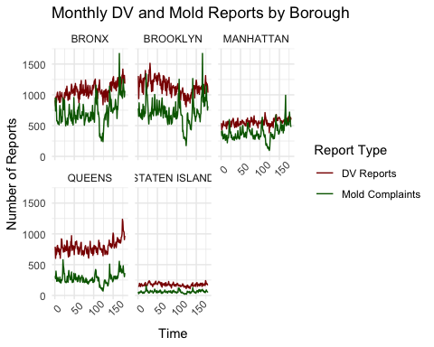 This project examines the relationship between residential mold complaints and domestic violence reports in New York City from 2010 to 2024. I am using two datasets from NYC Open Data: 311 Complaint Data to extract residential mold complaints and NYPD Complaint Data Historic to extract domestic violence reports. Using NYC 311 mold complaint data and DV report data, I explore whether these two types of reports follow similar patterns over time. The goal is not to determine causation, but to understand whether mold complaints and DV reports tend to rise and fall together.