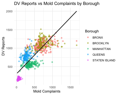 #> [1] 10571.03This linear regression model tests the association between monthly residential mold complaints and domestic violence reports within each borough rather than across the city.