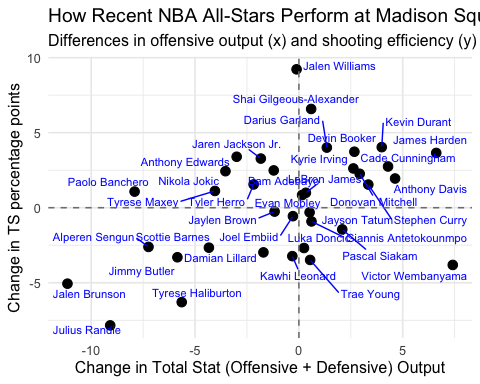 subtitle = "Differences in offensive output (x) and shooting efficiency (y) at MSG",