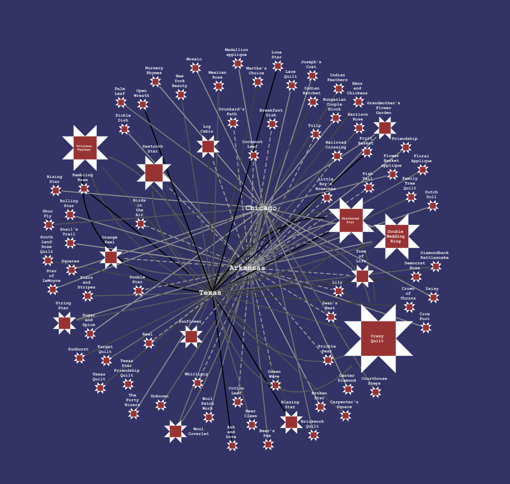 During the spring of 2013, I took Dr. Sula’s Information Visualization course, and I returned to the problem of network analysis. For this visualization experiment I retrieved a dataset from the Quilt Index by searching for quilts made in the different geographic locations where Gracie Mitchell lived when she lived there. Her interviewer, Bernice Bowden, recorded the places where Mitchell lived during her life and the years that she lived in each. The result is a sample dataset of quilters, her contemporaries, and the patterns that were being made around her, by her contemporaries, throughout her life. While Gracie Mitchell’s quilts may not have physically survived, their occurrence – or instantiation – was documented by an authority, so the goal of this ego-centric network was to create a digital object that shows the context in which Gracie Mitchell quilted and chose the twenty-two patterns that she executed.
