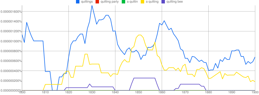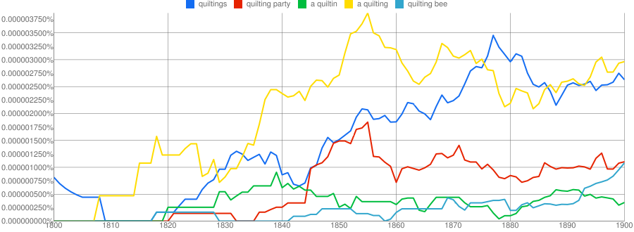 - The phrase “quiltin” peaks in American print in the 1840s (~0.000000850%) and “quilting party” in the 1850s (~0.000001750%).