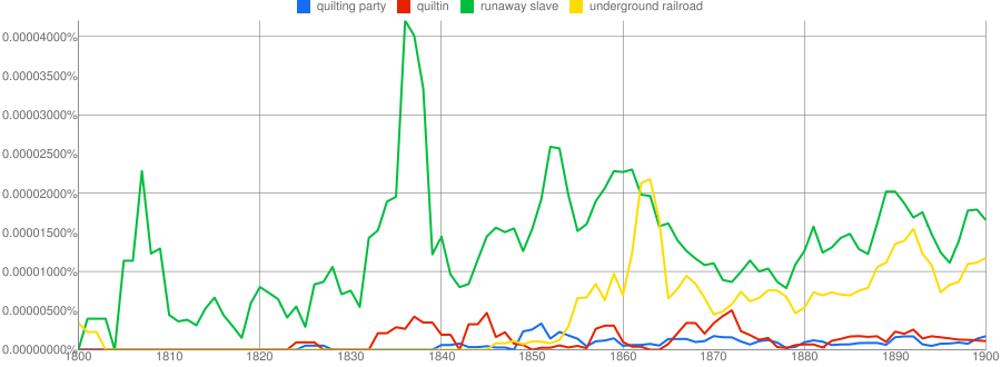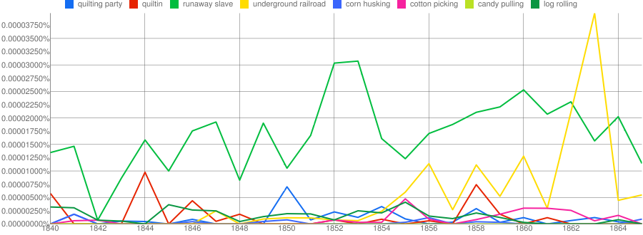 The Google Ngrams tool measures how often phrases occur in books scanned as part of the Google Books project, and so I looked at terms related to large gatherings of slaves, such as “cornhuskings,” “log rollings,” and “quilting parties,” as well as quilt block names. These were analyzed in relation to relevant time periods and terms, such as “runaway slave” and “underground railroad,” and presented as graphs with observations.