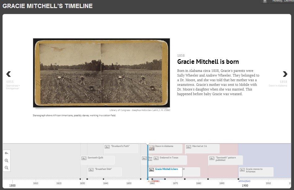 I created a timeline for Gracie Mitchell, using Timeline JS, in order to present an interactive object that gives context for the era during which she lived. In addition to dates from her life that she described during the interview, I researched the significant dates for the quilt patterns that she showed her interviewer in 1938. Copying the template provided by the Timeline JS site, I created a Google Sheet with time-series data related to details from Gracie Mitchell’s interview transcript, where the Bernice Bowden included two pages of notes. While one notes page lists all of the quilts that Mitchell showed Bowden that day, another page lists details such as the exact duration of Mitchell’s residence in each state and the years that she moved. Following that, I researched relevant historical items (including still images, audio, and video) for each time span, topic mentioned, or location lived in, and placed it in the appropriate place chronologically. I set the timeline to begin with the date she was interviewed, so that to read it the user has to go backwards in time from 1938. This software is easy to use and produces digital objects that are simple to navigate.