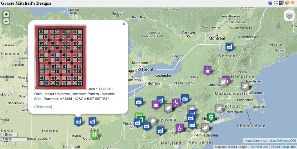 For our first foray into mapping I used the Leaflet Maps Marker tool (a WordPress plug-in) to create interactive maps of 19th century quilt pattern occurrences, relying on data from the online collection of the International Quilt Study Center and Museum. Gracie Mitchell’s interview transcript provided me with a thematic grouping of quilt patterns to work with, and each map uses one of Leaflet Maps Marker’s symbols to represent a quilt pattern. The symbols are placed where the quilt was made. Clicking on the symbol provides a pop-up window with metadata for the particular quilt, and the aggregated map, shown in figure 9, depicts all of the maps layered together.