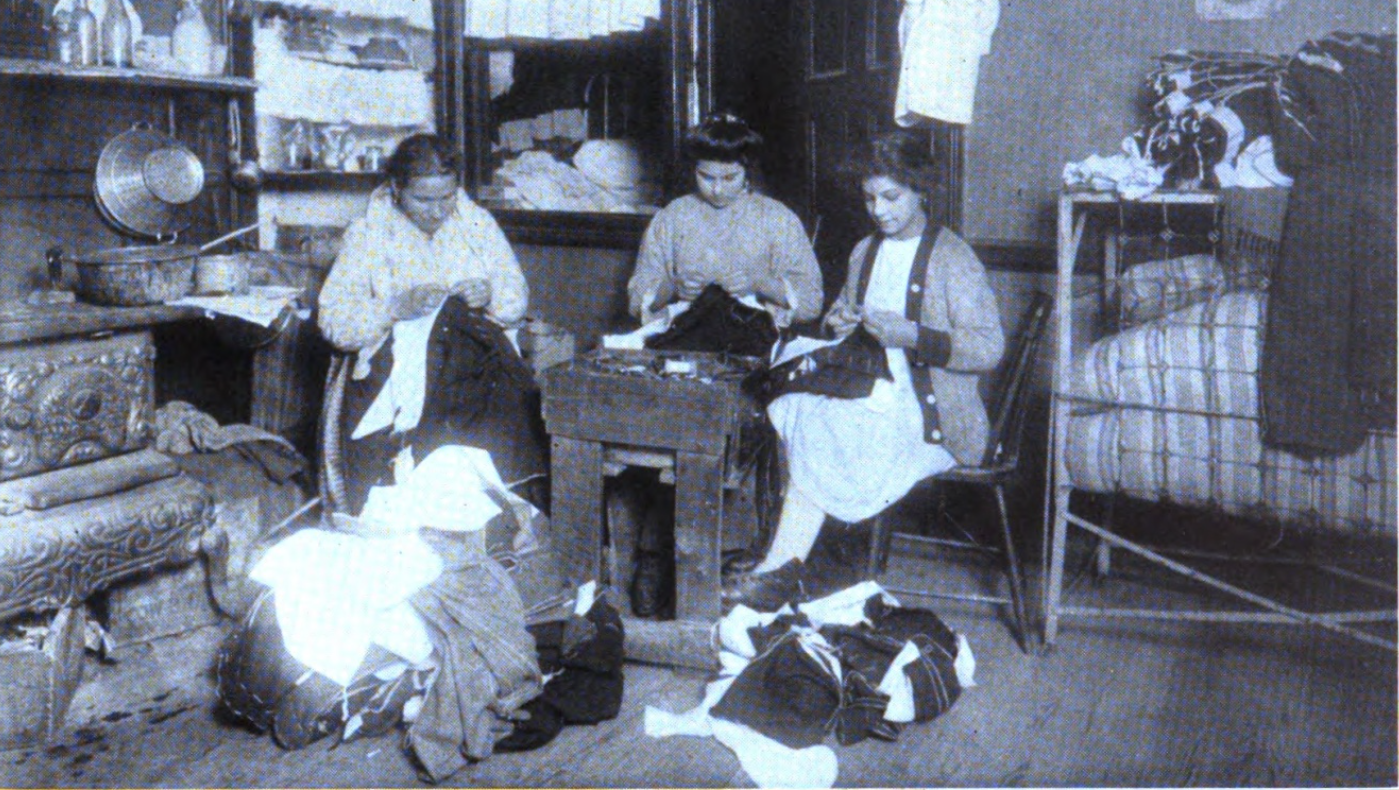 No matter who you are or how remote from your concern the immigrant may seem to be, it is safe to say that the work of his hands has ministered to your need or pleasure through years; that it is doing so today and will continue to do so tomorrow. It may be that the gang of Italian workmen passing your door from work on the new railroad bed is your only thought of the "immigrant." That does not touch you very personally. Have you ever wondered where the hundreds of articles sold every day in the big department stores come from? Most of them, especially the "white goods," underwear, and embroidered things are made or "finished" in city tenements by the quick and clever fingers of immigrant women and children. The great bulk of ready made clothing for men and boys is finished in these same tenements. The food you eat, the multiplied list of "canned goods" is prepared or packed largely by immigrant men, women and children in factories throughout the country.