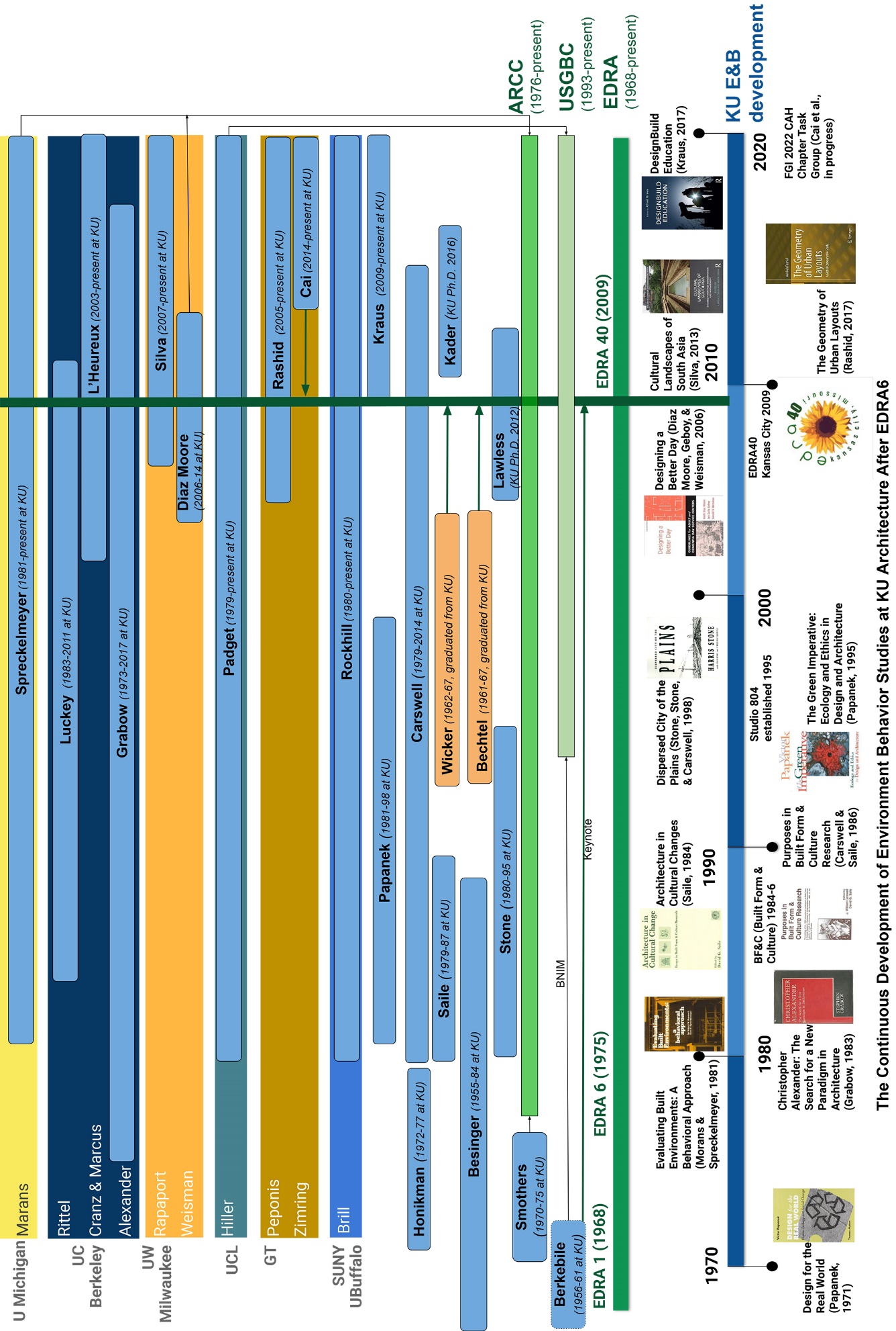 Finally, the new generation of scholars in the architecture program now includes fifteen doctoral graduates, a number of whom are active in EDRA and the EB field in general. Julie Lawless was the first KU doctoral graduate in architecture in 2012, where she focused on the definition and design of home-like spaces to support the process of assimilating to university life in congregate student housing environments. She is now an adjunct faculty member in KU’s urban planning program. Sharmin Kader is a 2016 graduate whose dissertation was the development of post-occupancy protocols for hospice environments. She is the director of research of at TreanorHL Architects and an EDRA board member. Both faculty and students continue to build academic and scholarly relationships with colleagues at KU in engineering, geology, medicine, nursing, social work, public health, history, and gerontology. Unfortunately, there have been no formal ties between architecture and psychology since the 1970s.