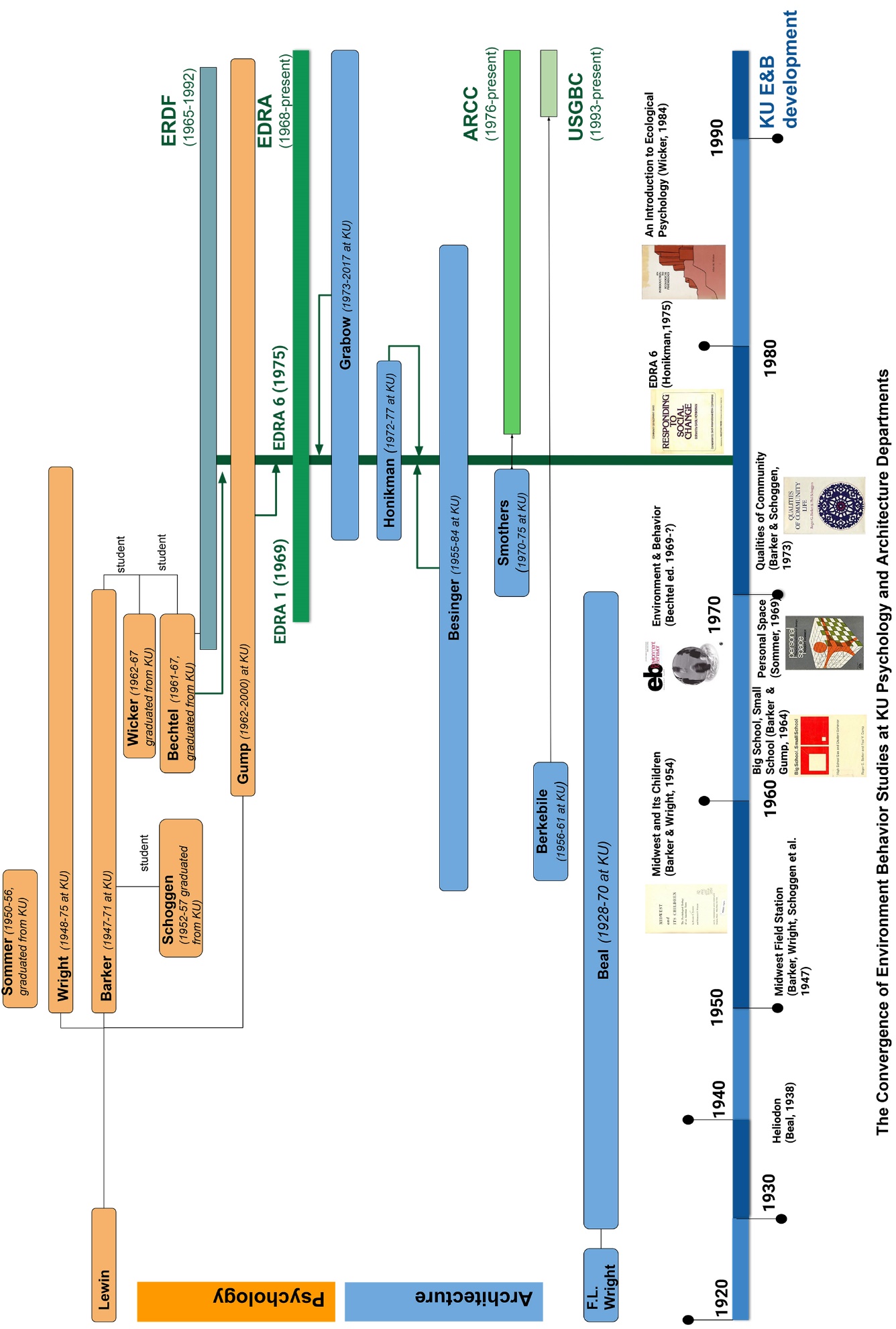 It is not surprising that fundamental questions arose at this time in the design and engineering professions, education, and the social sciences that attempted to quantify, rationalize, and predict the ways that new forms of built space could accommodate these new changes in rural settings. This paper is an attempt to explain how and why the study and use of Environment Behavior (EB) research was a natural outgrowth in the late-1940s at the University of Kansas (KU). The thesis of the paper is that the evolution of Environment Behavior studies was and continues to be the direct result of cultural, climatic, geographic, and economic influences that define, in fundamental ways, the place we call “the Midwest.” Midwest happens to be in this instance eastern Kansas, but could have otherwise been situated in any rural, agricultural, low-density environment. In order to simplify – in reality over-simply – our narrative we have chosen two individuals to mark the origins of this evolution at KU: Roger Barker and George Beal. Barker was the founding director in 1947 of the Midwest Psychological Field Station in the small Kansas town of Oskaloosa. Beal was the Chair of Architecture in the School of Engineering between 1945 and 1962 and built his career before that developing Frank Lloyd Wright’s Usonian building concepts and inventing one of the first heliodons, an instrument to measure the effects of solar access on buildings. From these two independent academic strands and the processes that followed in their collective wake we want to present an intellectual “family tree” of who, what, why, and when the pattern of Environment Behavior studies emerged at KU, and how it has been sustained by a direct and intimate connection to a sense of place and the process of place making. The narrative is not a detailed analysis of theories and methods of Environment Behavior research and design. It is an explanation – primarily from an architectural perspective – of the individuals that used the associations of colleagues who were instrumental in EDRA’s development to advance the view of design as a human-centered and socially driven process.