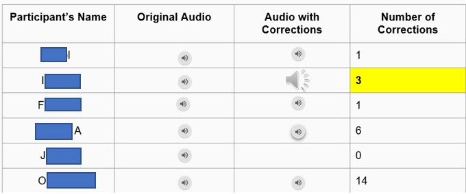 Table 1 below (columns left to right) illustrates the participant’s name, original audio file, the edited audio file, and the number of mispronounced words. While it is true that in most of the cases there were three mispronounced words or less, it is also worth noting that in the other two cases there was a total of six and 14 mispronounced words, respectively.