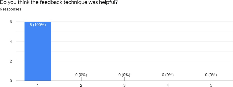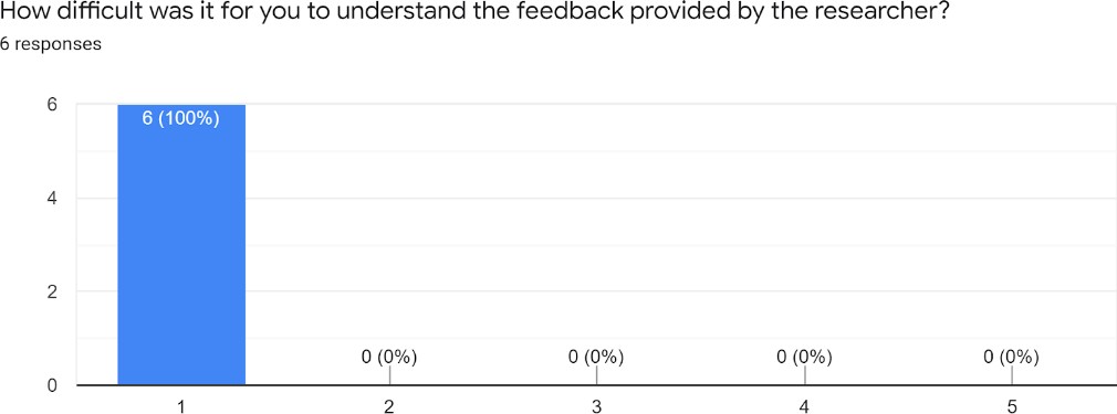 When asked about the difficulty of understanding the researcher’s feedback, all participants (100%) stated that it was “Very easy” (Figure 2).