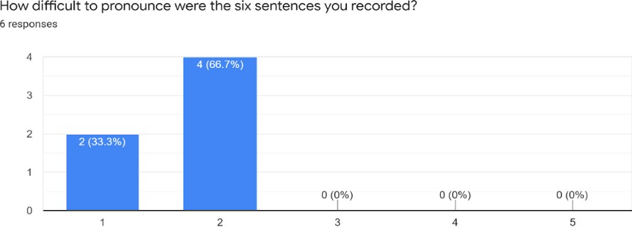 Figure 1 above illustrates participants’ responses regarding their difficulty in pronouncing the sentences they recorded. Most of them responded that they found it “Very easy” and “Easy.” Their combined total was 100%.