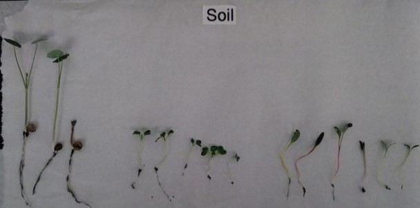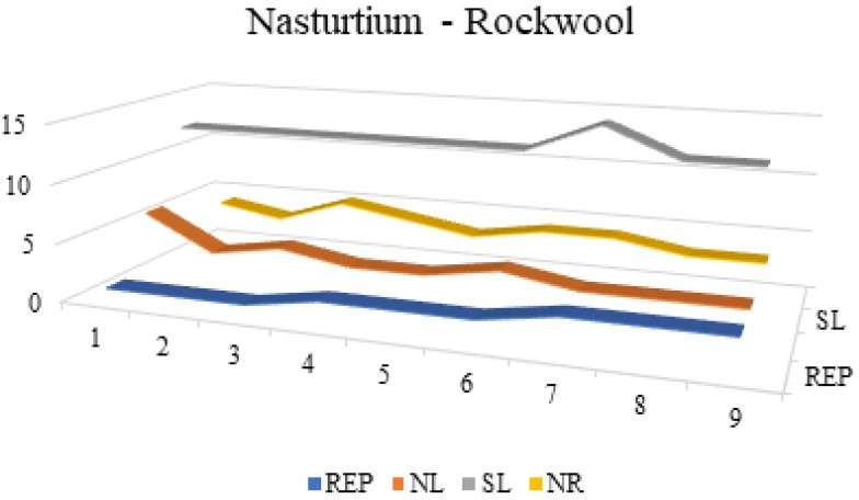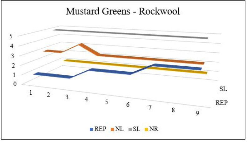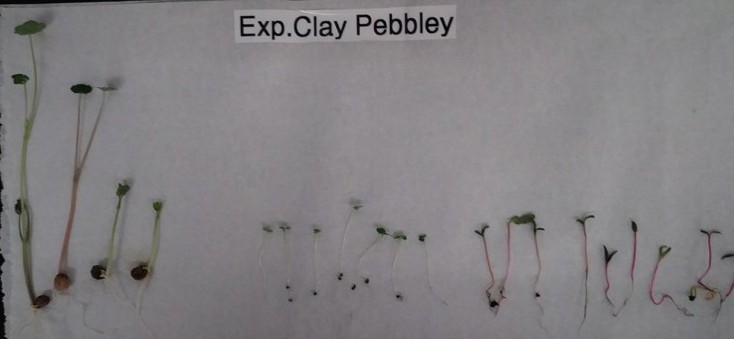 The experiment was carried out in the Natural Science Department of Hostos Community College, Bronx-NY. Seeds (Johnny’s Selected Seeds®) of nasturtium, mustard greens and swiss chard were established in trays with rockwool, soil (Miracle-Gro Potting Mix®), and expanded clay pebbley. After germination, the following variables were analyzed: NL – number of leaves, NR – number of roots, and SL – shoot length.