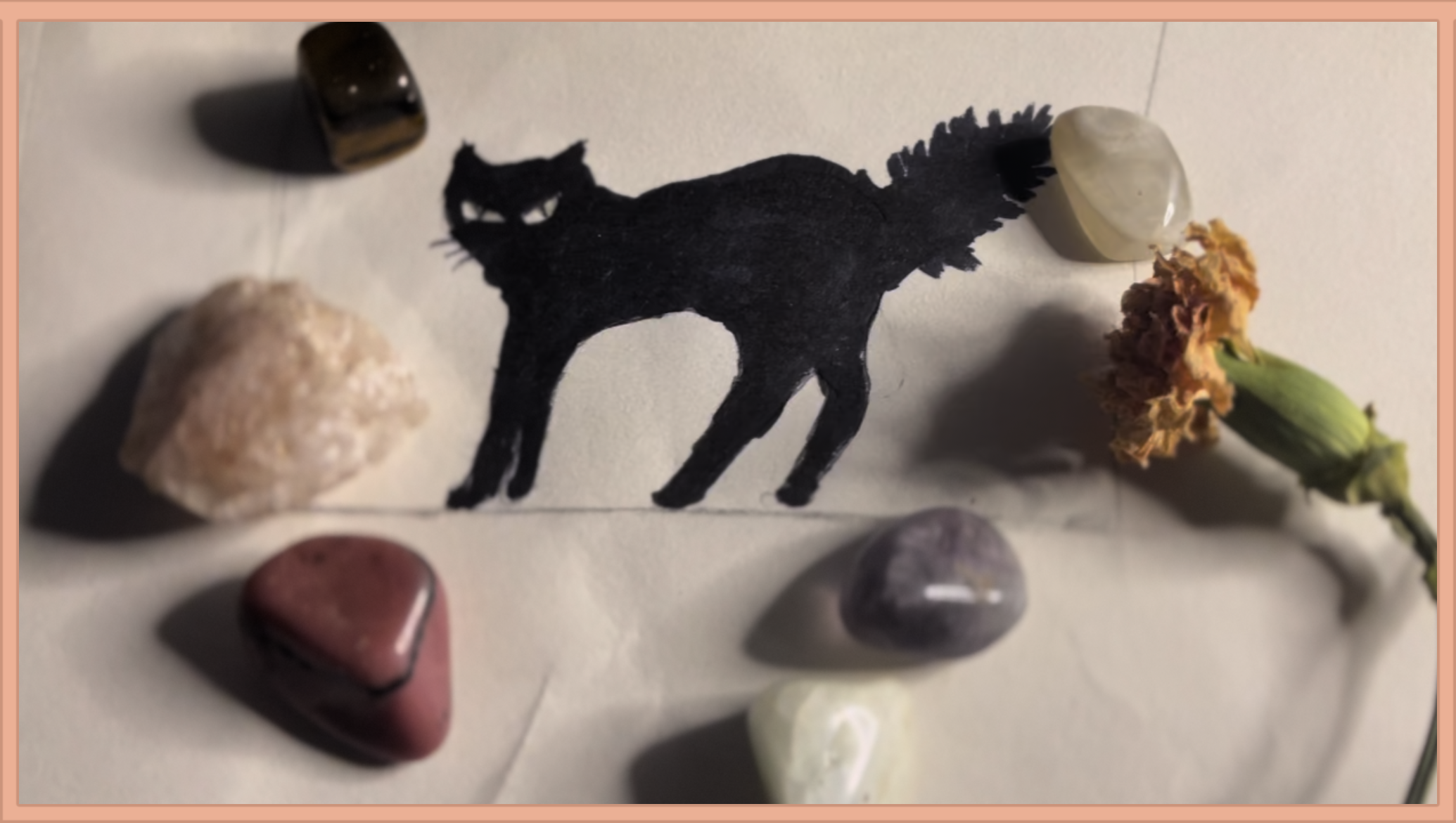 A black cat surrounded by a dried flower and various crystals. © Spence