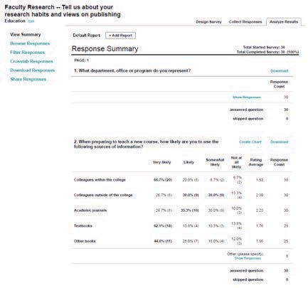 The survey was conducted using the online tool SurveyMonkey during the fall semester of 2011. It was sent out the List of Teaching Faculty and thirty faculty members responded. Although the number of responses was relatively small, they represented a good sampling of disciplines and departments—including Allied Health, Natural Sciences, English, Mathematics, and Behavioral and Social Sciences. This discussion will focus on questions 2 and 3, which relate to using information to prepare for classes, and question 4, which addresses the use of in- formation resources for research. When preparing a new class, faculty continue to rely on textbooks and other books: 62% are very likely to use textbooks, and 44% are very likely to use other books. Also, not surprisingly, 26 of 30 respondents were either very likely or likely to consult with colleagues within the college. Sources of information most frequently used when preparing for classes include websites of professional organizations and research databases. Although few mentioned books specifically, one respondent painted an amusing picture: “I go to Barnes & Noble bookstore... [with a] folding chair and pull out books for evaluation.” Surprisingly, several respondents mentioned Wikipedia as a source of information used for preparing for classes. Although many faculty do not allow students to use Wikipedia for assignments, there are clearly a range of views across campus regarding its usefulness in academic pursuits. No one mentioned traditional reference sources, such as the Encyclopedia Britannica (either print or online), which provide general over- views and help with quick fact-checking. The responses to this question reveal that faculty are sticking to textbooks and consulting with colleagues when preparing for courses, and remaining loyal to discipline-specific online resources, such as websites of professional organizations and discipline-specific databases.