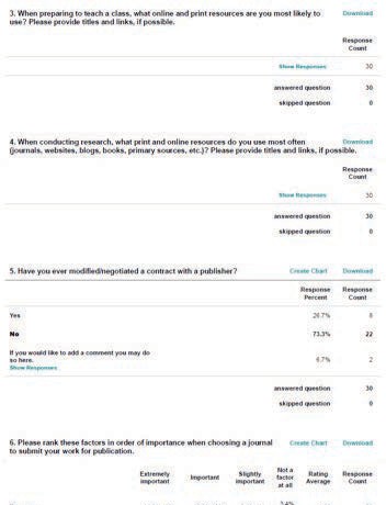 Another question that yielded interesting information was question 4: “When conducting research, what print and online resources do you use most often (journals, websites, blogs, books, primary sources, etc.)? Please provide titles and links, if possible.” Faculty provided specific names of key journals and professional websites in their fields when answering this question. These responses confirmed recent studies in information use of faculty, which found that they prefer to stay current by consulting a few core journals in their disciplines (Tenopir 2003 p. v). Moreover, social media, mostly blogs, make an appearance in the context of faculty research. In general, faculty are more open to using a variety of different kinds of information resources, including social media, for their own research than for their teaching.