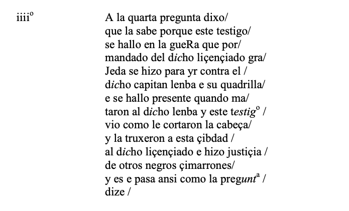 Lee el siguiente párrafo tomado del manuscrito original en donde se relata la muerte del negro cimarrón Sebastián Lemba (No. 062). Anota en una tabla palabras que entiendes y palabras que no entiendes del párrafo. De las palabras que sepas el significado, intenta explicar en tus palabras el significado. De las que no conoces el significado, escribe una hipótesis para compartir con la clase.