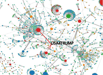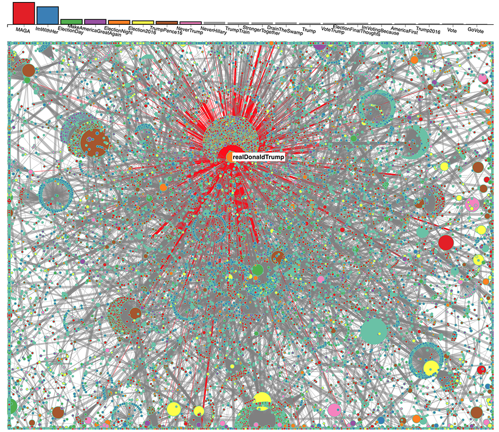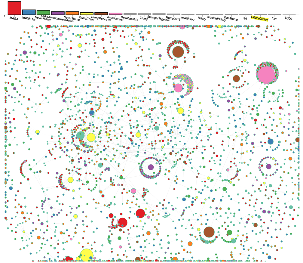 In previous chapters we studied social justice networks and affective publics from the bottom up. The interviews in Chapters 4 and 5 provided further insights into how social justice activists engage social media as part of their larger public presentation, as well as specific strategies such as hashtag hijacking. Now, we look at “gaming” the social media networks for political ends. Our case study is the 2016 presidential election in the U.S., where we visualize the structure of Twitter networks from political hashtags across the ideological spectrum (e.g., #MAGA, #ImWithHer, and #FeelTheBern). We look at network structures across the political spectrum and examine how different political strategies might lead to different network structures. Moreover, we look at the extent to which trolls and bots might influence these Twitter networks, as well as the impact that individual Twitter posters had during critical moments of the campaign, especially during the presidential debates between candidates Donald Trump and Hillary Clinton. A related purpose of this set of data visualizations of Twitter activity is to measure the relative popularity of tweets from Russian-based trolls and bots compared to those made by the candidates, celebrities, and other social media influencers. For instance, a Pew Research Center study predicted that it is bots that post about two-thirds of tweeted links to popular websites, rather than humans.1