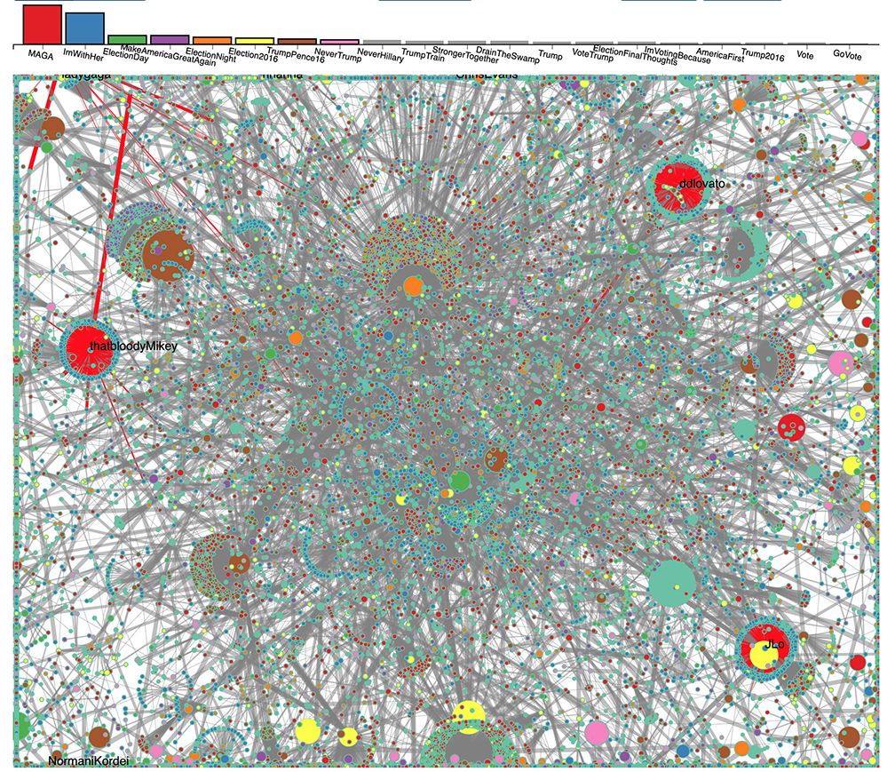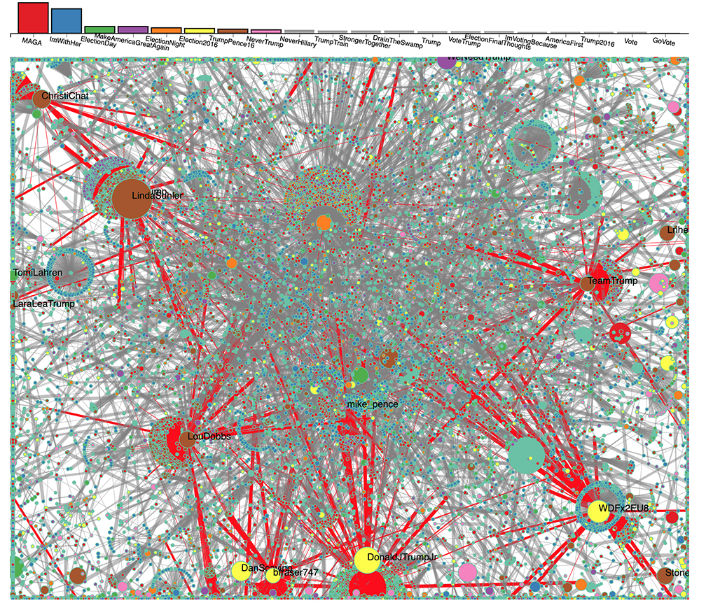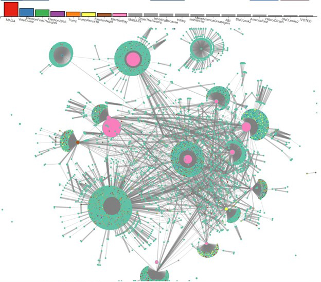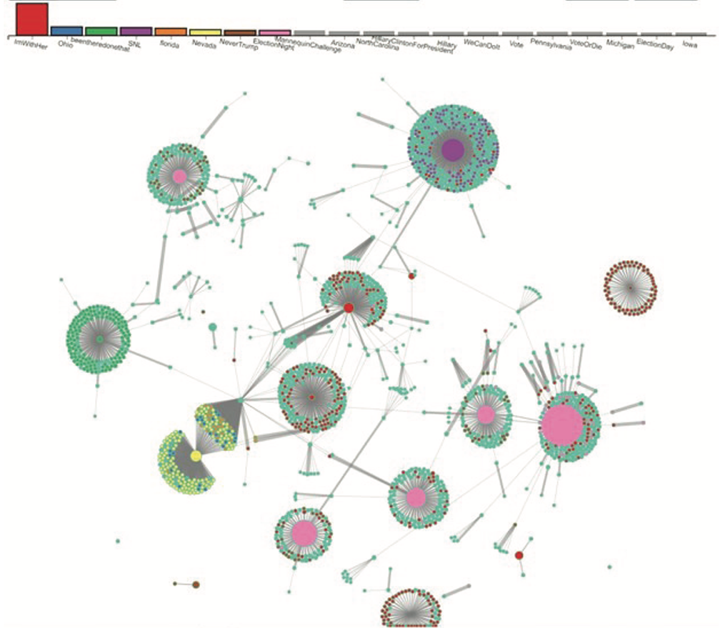 If you look at the network that surrounds Hillary Clinton’s account, the pro-Trump subnetworks have overwhelmed that landscape too. While Trump’s Twitter account has all of these subnetworks budding off of him, not all of them are leading back to him. Rather, the pro-Trump subnetworks appear to have their own center of gravity, and have even co-opted opposing hashtags, such as “#ImWithHer”. In summary, the pro-Trump dominance on Twitter is multi-tiered and even legacy media outlets are neutralized in their scope.