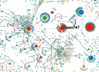 You can perform your own “knockout” experiments with this data set and observe the growth of several subnetworks, which appear to be right-wing influencers that are not part of the Trump campaign. In essence, the subnetworks of pro-Trump nodes have metastasized and become a highly resilient network overall. Even if you take out the center node, from the Trump campaign, the broader network is still there. Some of the most prominent of these subnetworks are nodes formed by the “bfrazer747” node (see Figure 6.3), the “TeamTrump” node (see Figure 6.4), and the “USA4Trump” node (see Figure 6.5).
