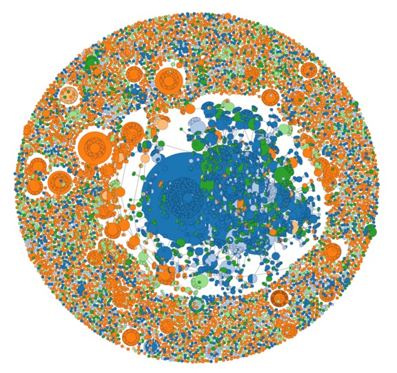 In Figure 6.23, the left-leaning hashtags are represented as nodes of certain colors (colors representing hashtags) where matching colors hover around a major node. Two examples include the major yellow nodes, which consist of primarily of handles connected to these major nodes using these same major hashtags. Additionally, while there is some interconnection among the major nodes and the followers surrounding them within the left, overall they appear only sparsely connected. There are a lot of empty spaces within the network and weaker connections between each node.