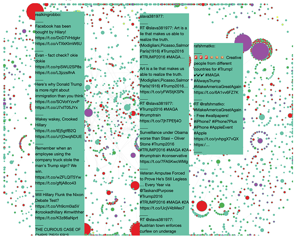 Additionally, we wanted to examine “broker figures,” which are Twitter accounts that do not necessarily provide new content but provide bridges in the social network through their retweets and number of followers. According to basic social networking theory,2 if you take out the bridges, you diminish the network. For example, three bot-generated tweets appear at the heart of a pro-Trump continent that feature Cyrillic script, as well as the #Ukraine hashtag. Other examples are references to the iPhone7 release in tweets linked to pro-Trump posts, thereby connecting unrelated tweets about the release of a popular mobile device to pro-Trump discourse (see Figure 6.2). It appears that bots were gaming the system (or hijacking hashtags) by utilizing some of the most popular (although unrelated) hashtags to increase the exposure of pro-Trump messages, which is a subtle and insidious form of influence. Beyond election messaging, this use of bots challenges the utopian view of social media and social networks, as large nodes can be artificially manufactured with insidious actors trying to game the system.