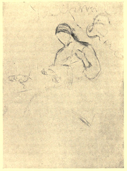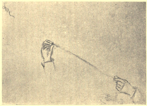 One more instance of the connection of the art side with the constructive side. The children had been studying primitive spinning and carding, when one of them, twelve years of age, made a picture of one of the older children spinning. Here is another piece of work which is not quite average; it is better than the average. It is an illustration of two hands and the drawing out of the wool to get it ready for spinning. This was done by a child eleven years of age. But, upon the whole, with the younger children especially, the art impulse is connected mainly with the social instinct—the desire to tell, to represent.