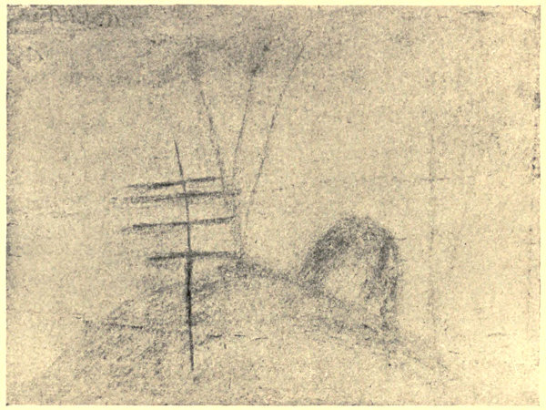 Another instinct of the child is the use of pencil and paper. All children like to express themselves through the medium of form and color. If you simply indulge this interest by letting the child go on indefinitely, there is no growth that is more than accidental. But let the child first express his impulse, and then through criticism, question, and suggestion bring him to consciousness of what he has done, and what he needs to do, and the result is quite different. Here, for example, is the work of a seven-year-old child. It is not average work, it is the best work done among the little children, but it illustrates the particular principle of which I have been speaking. They had been talking about the primitive conditions of social life when people lived in caves. The child’s idea of that found expression in this way: the cave is neatly set up on the hill side in an impossible way. You see the conventional tree of childhood; a vertical line with horizontal branches on each side. If the child had been allowed to go on repeating this sort of thing day by day, he would be indulging his instinct rather than exercising it. But the child was now asked to look closely at trees, to compare those seen with the one drawn, to examine more closely and consciously into the conditions of his work. Then he drew trees from observation.