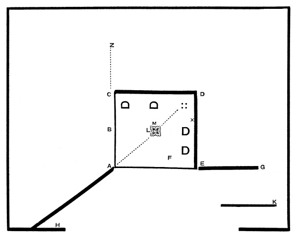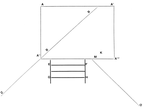 K.—Place where the objects to be reflected in the looking-glass were placed, but quite concealed from the audience with a door, closed when the exhibition was going on.