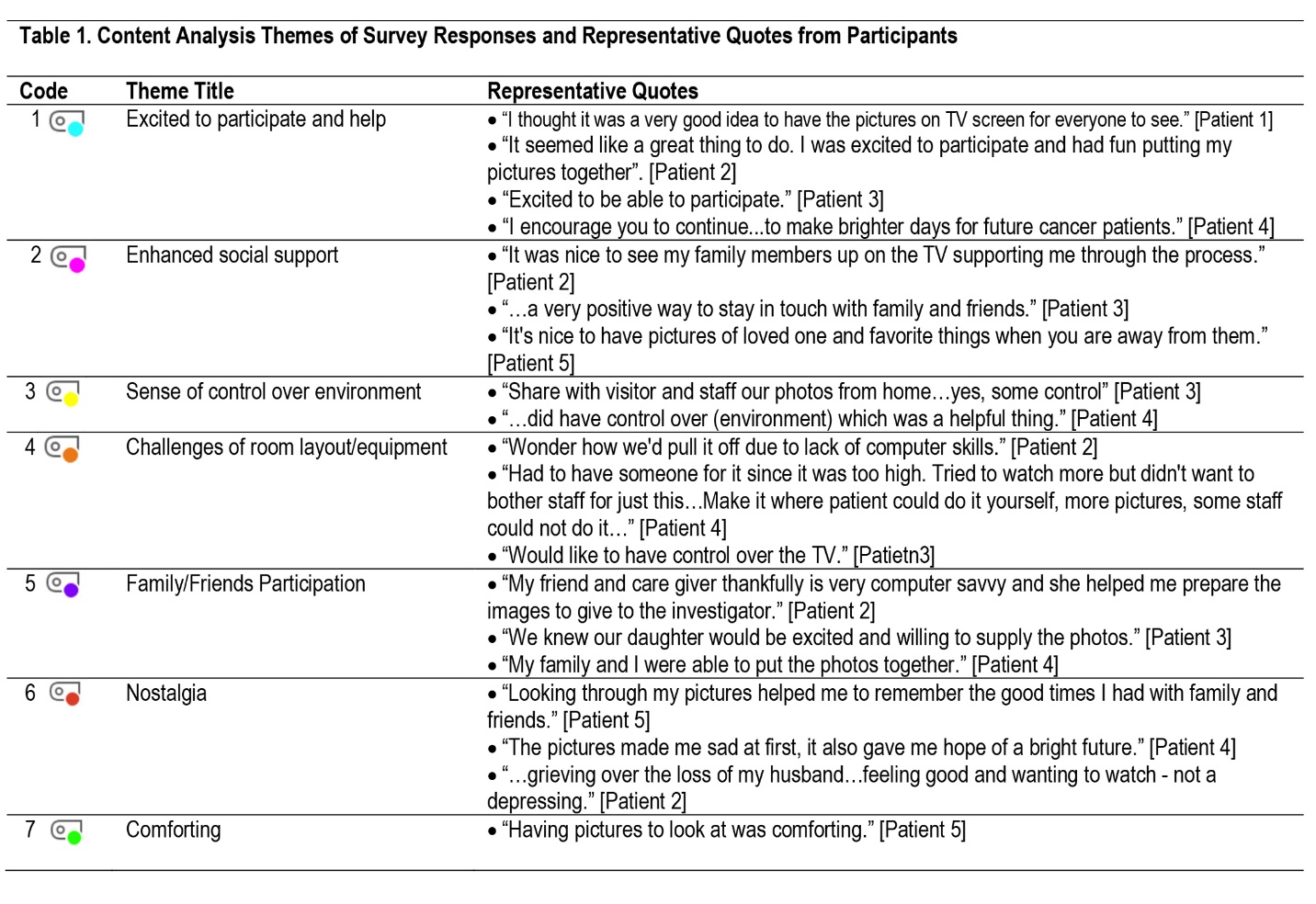 The goal of N=10 was set in conjunction with the staff of the Cancer Institute and based upon their best estimates about how many potential recruits would be in the BMTU pipeline over the anticipated timeframe of our study. We were eventually able to discuss the study with eight potential participants. The day we were to inform/consent the ninth, she was deemed by the Cancer Institute to be too sick to go through the BMT process. Six chose to participate, with one of those passing away during the study. Of the two who chose not to participate, one was a young woman in her mid-20s who indicated she did not have many pictures, did not want to gather them, and she felt pictures of things she loved would just make her homesick during her stay. Another, a woman in her mid-40s, liked the idea of the image display, but she felt she would just look at things on her smart phone, indicating that if she was not feeling well enough to do that, she would not be looking at them on a television monitor. Ultimately, five participants completed the study, resulting in a completion rate of 62.5%.