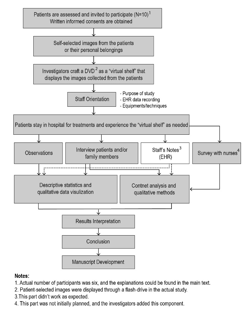 The research was conducted as a qualitative study whereby we would make use of observations, patient feedback, and staff feedback in order to arrive at some initial conclusions as to the efficacy of the display of self-selected imagery on improving patient experience in the in-patient setting. Figure 1 illustrates the planned initial research procedures. The study schema was our anticipated roadmap and was developed in conjunction with the nursing staff of the West Virginia University’s Cancer Institute, Bone Marrow Transplant Unit (BMTU), and the Spiritual Care and Counseling unit. Footnotes to Figure 1 explain the major variances to our schema that occurred over the course of the study.